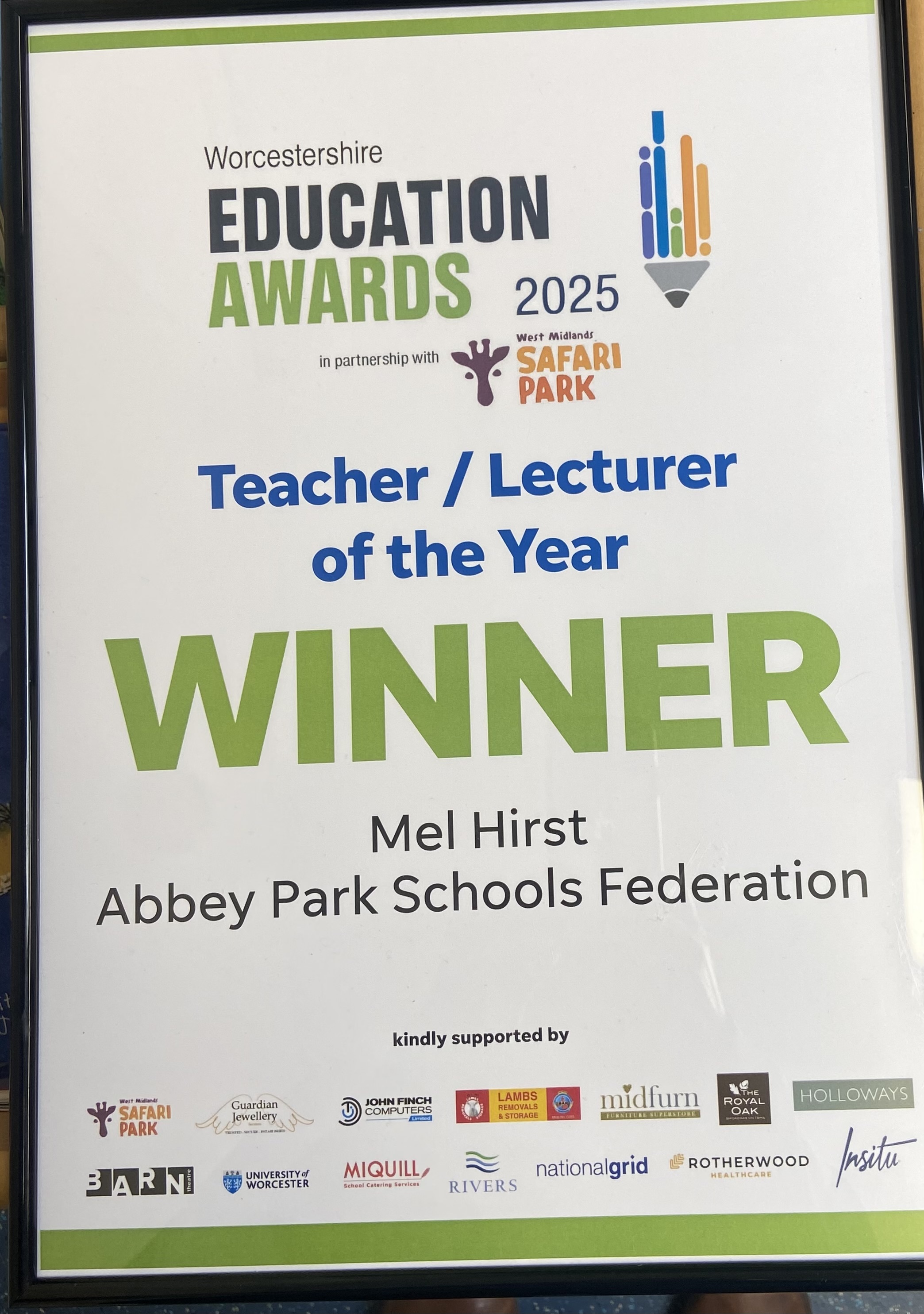 We are delighted to announce that Miss Hirst has won the best teacher/lecturer of the year award at the Worcestershire Education Awards. Congratulations Miss Hirst, we are so proud of you.