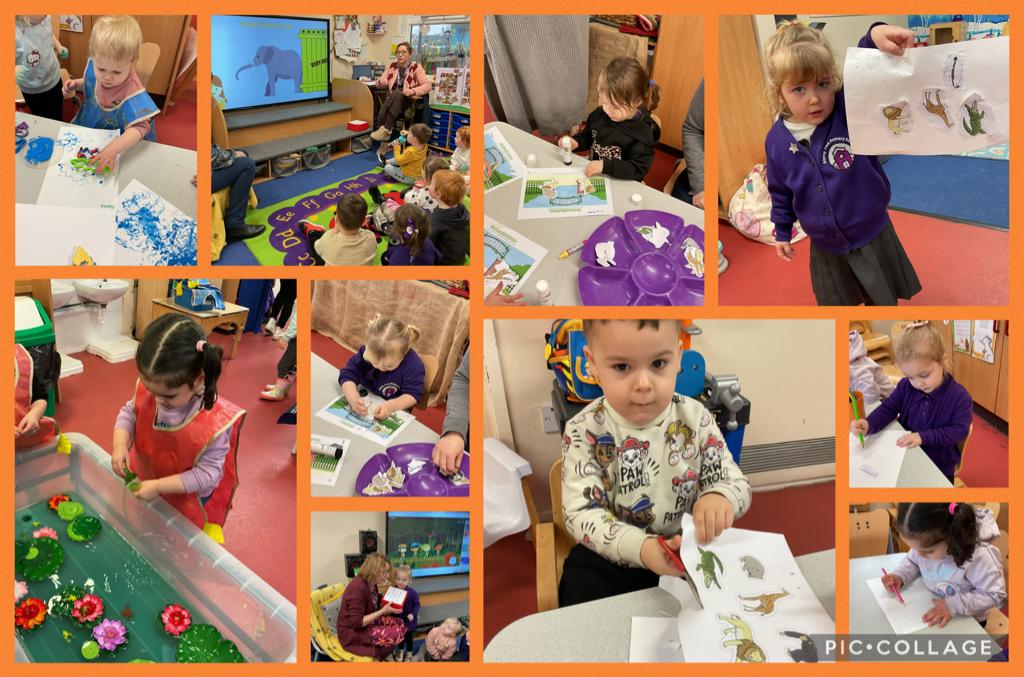 This week we have explored the jungle. We helped the animals that had got stuck in the jelly, we painted various jungle animals using forks, brushes, pads and our hands. We are practicing using scissors to make a jungle picture.